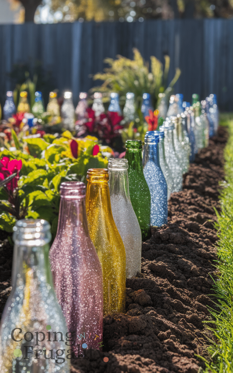 Recycling glass bottles is not only eco friendly but also one of the most creative DIY garden edging ideas on a budget you can try. Collect bottles of the same height in different colors and bury them neck down along your garden bed edges. When the sun shines the glass catches the light and creates a sparkling effect that looks magical especially during the golden hour so it turns a simple garden border into a charming decorative feature full of personality and life.