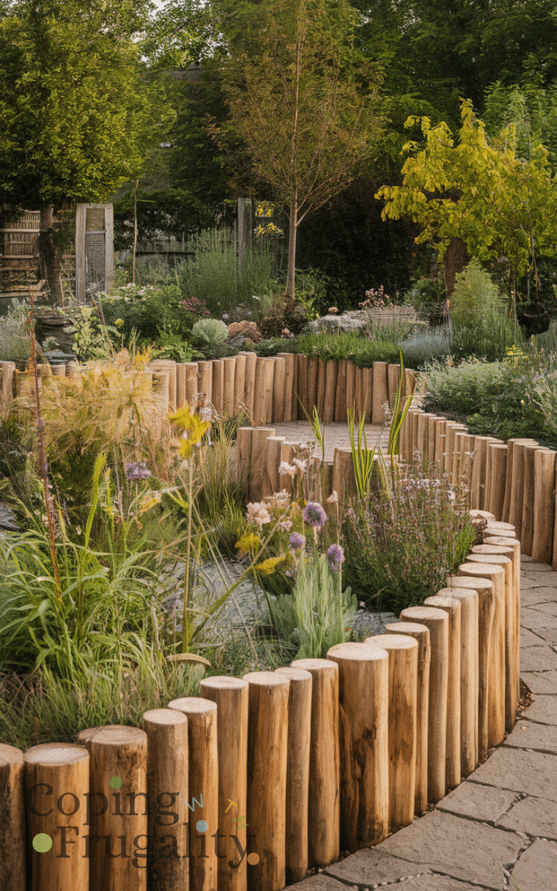 If you love a natural rustic style then wooden logs make a wonderful border and are among the most charming DIY garden edging ideas on a budget. You can cut logs of similar height and place them vertically side by side or use thinner branches for a more whimsical design. The natural texture of the wood blends beautifully with flowers and plants and you can easily find logs from fallen branches or leftover firewood which means you can create this border almost for free and with a lovely organic touch that feels right at home in any garden.