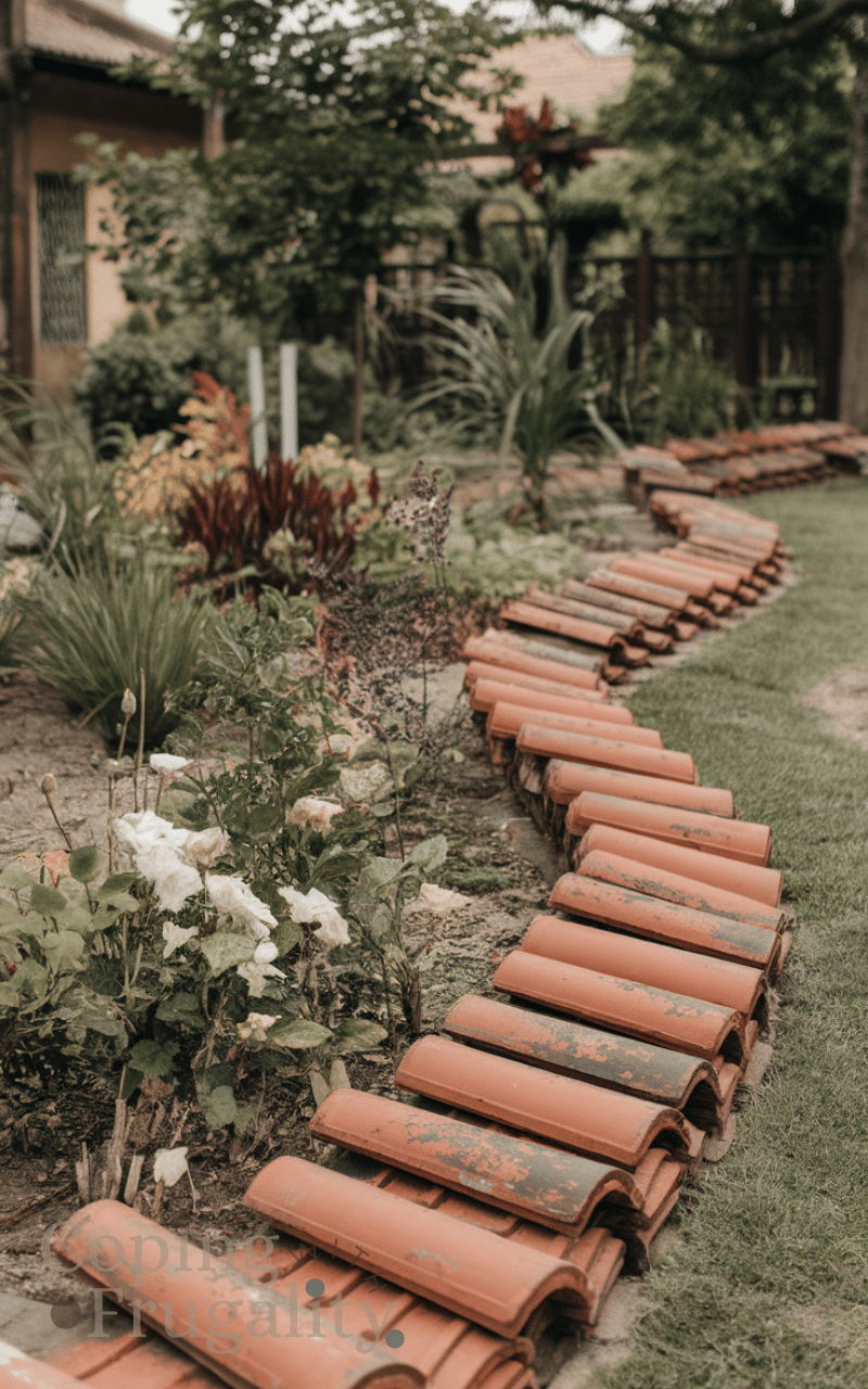 Old roof tiles can find new life as one of the smartest DIY garden edging ideas on a budget. Simply place them partly buried side by side to create a wavy and elegant edge. The curved shapes give visual interest and help keep soil in place while the reddish tones of the clay bring warmth and character that make your garden look timeless and welcoming.