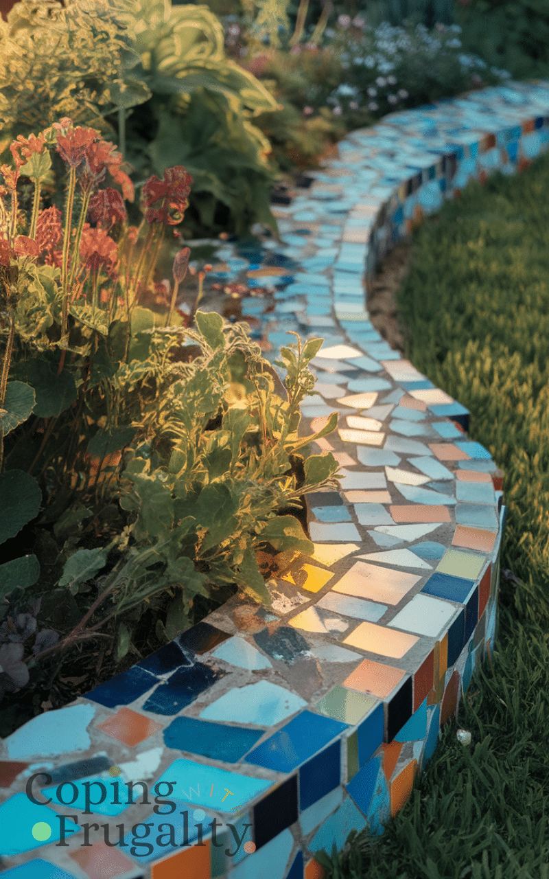 For a colorful artistic touch you can make one of the most eye catching DIY garden edging ideas on a budget by using broken tiles. Gather leftover tiles from renovation projects and arrange the pieces like a mosaic along the garden border. The random colors and shapes create a unique pattern that reflects sunlight beautifully and turns your garden edge into a cheerful and personal artwork full of character and charm.