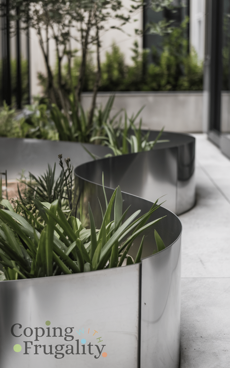 If you want something sleek and modern then using recycled metal sheets can be one of the coolest DIY garden edging ideas on a budget. You can cut old roofing panels or scrap metal into strips and bend them gently to follow your garden’s shape. The shiny metallic finish adds contrast to the green plants and gives your outdoor space an industrial yet stylish edge that is surprisingly affordable and durable too.
