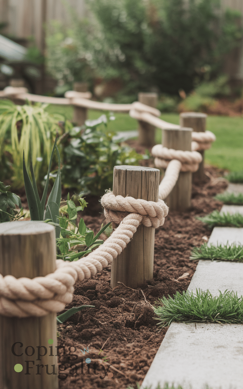 Combining rope with small wooden posts creates one of the most nautical inspired DIY garden edging ideas on a budget. Drive small wooden stakes into the soil and run a thick rope through them to create a charming border that defines your garden path or separates different areas. It feels both simple and elegant and the mix of textures adds warmth and character while staying budget friendly and easy to install even for beginners.