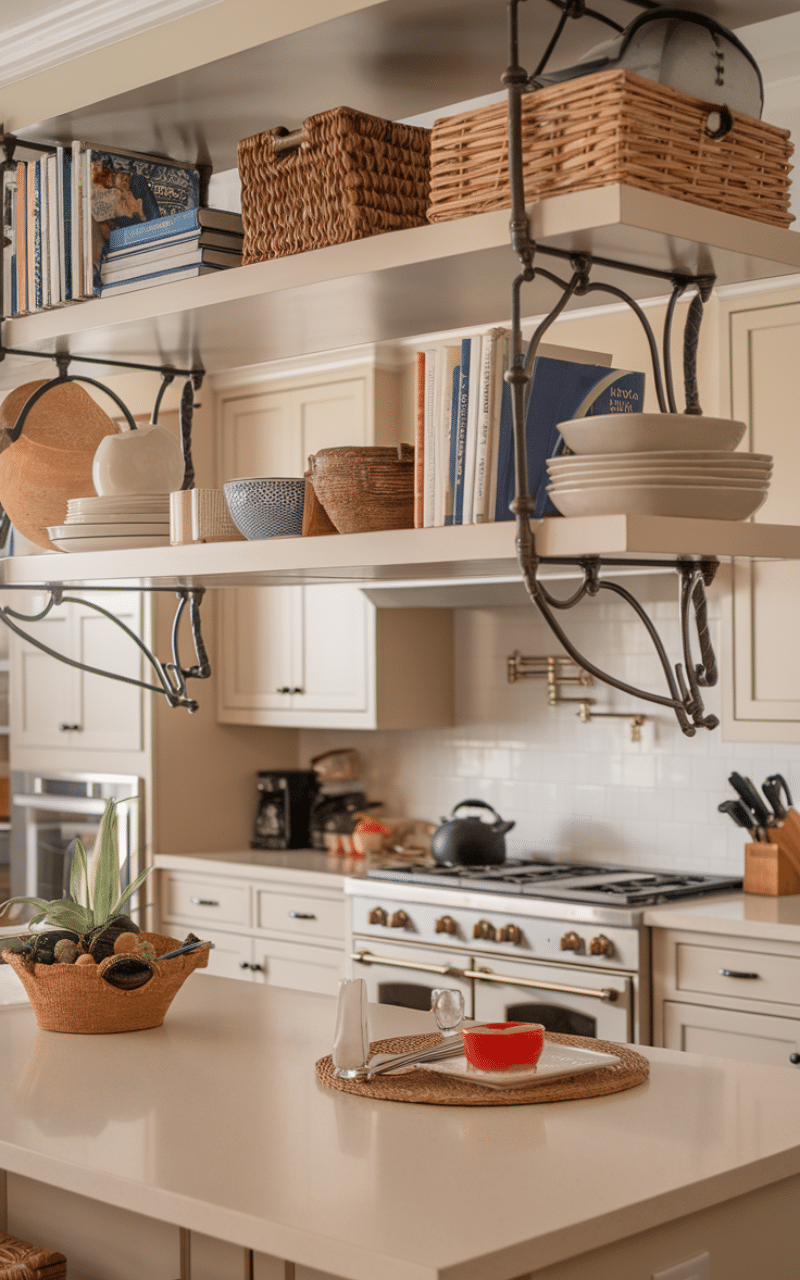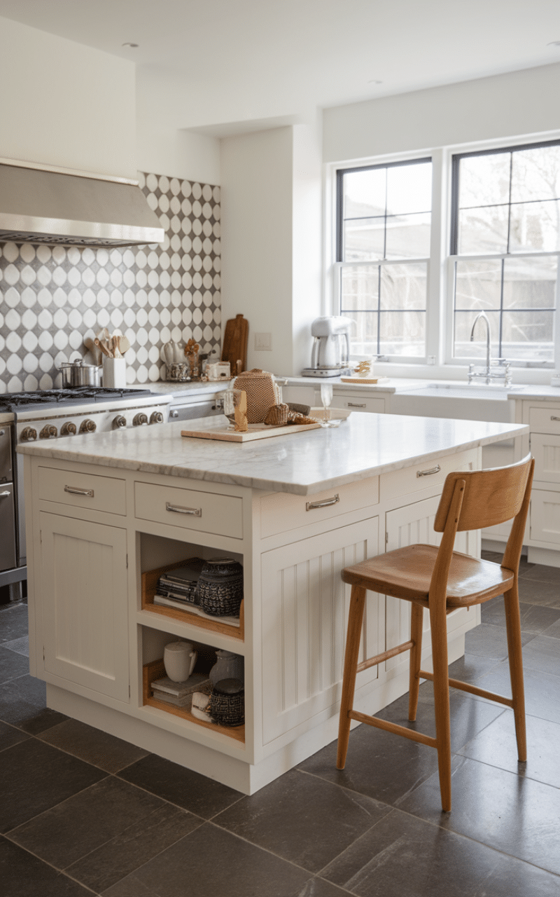 Open shelves under the island add personality and convenience. I enjoy displaying cookbooks, baskets, or decorative dishes because they make the kitchen feel lived-in and welcoming. This setup keeps essentials nearby while adding visual interest without cluttering the workspace.