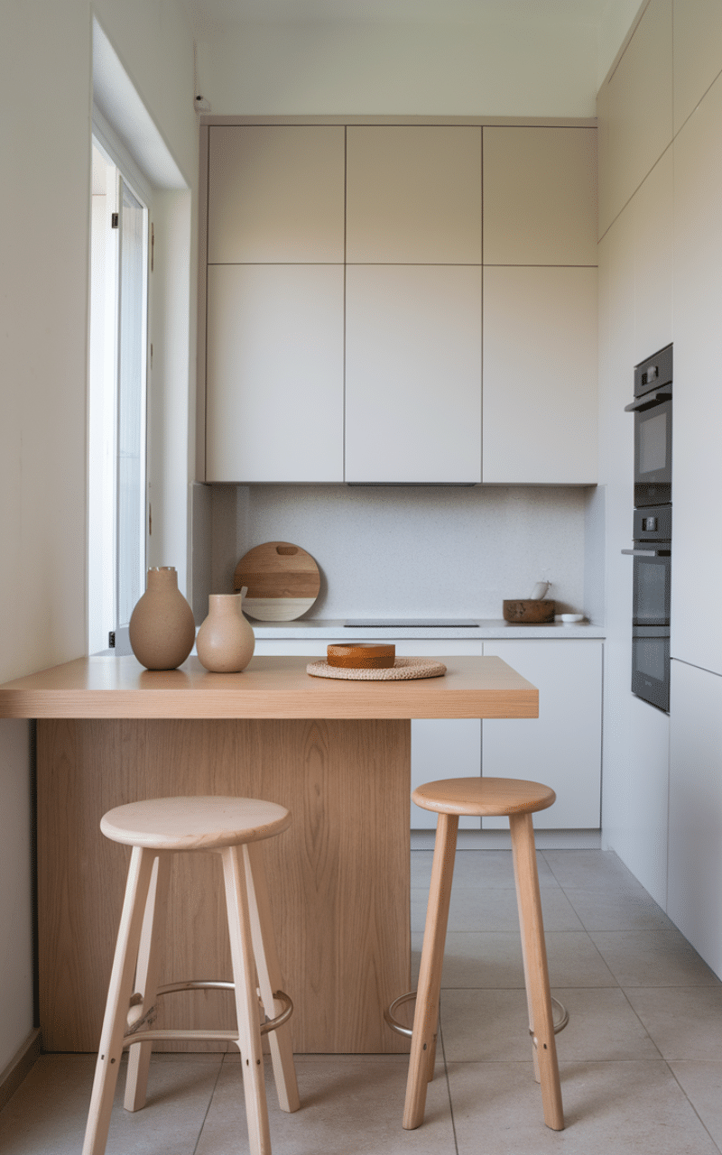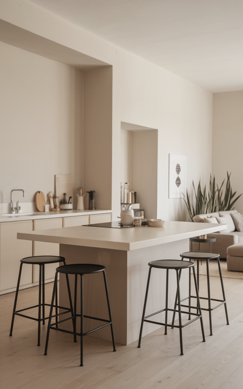Simple lines and uncluttered surfaces create a calm kitchen environment. I like how a minimalist island keeps everything looking organized while still offering practical seating space. Neutral tones help the island blend smoothly with surrounding cabinets, making the kitchen feel larger and brighter. Choosing slim stools keeps movement easy and comfortable around the workspace.