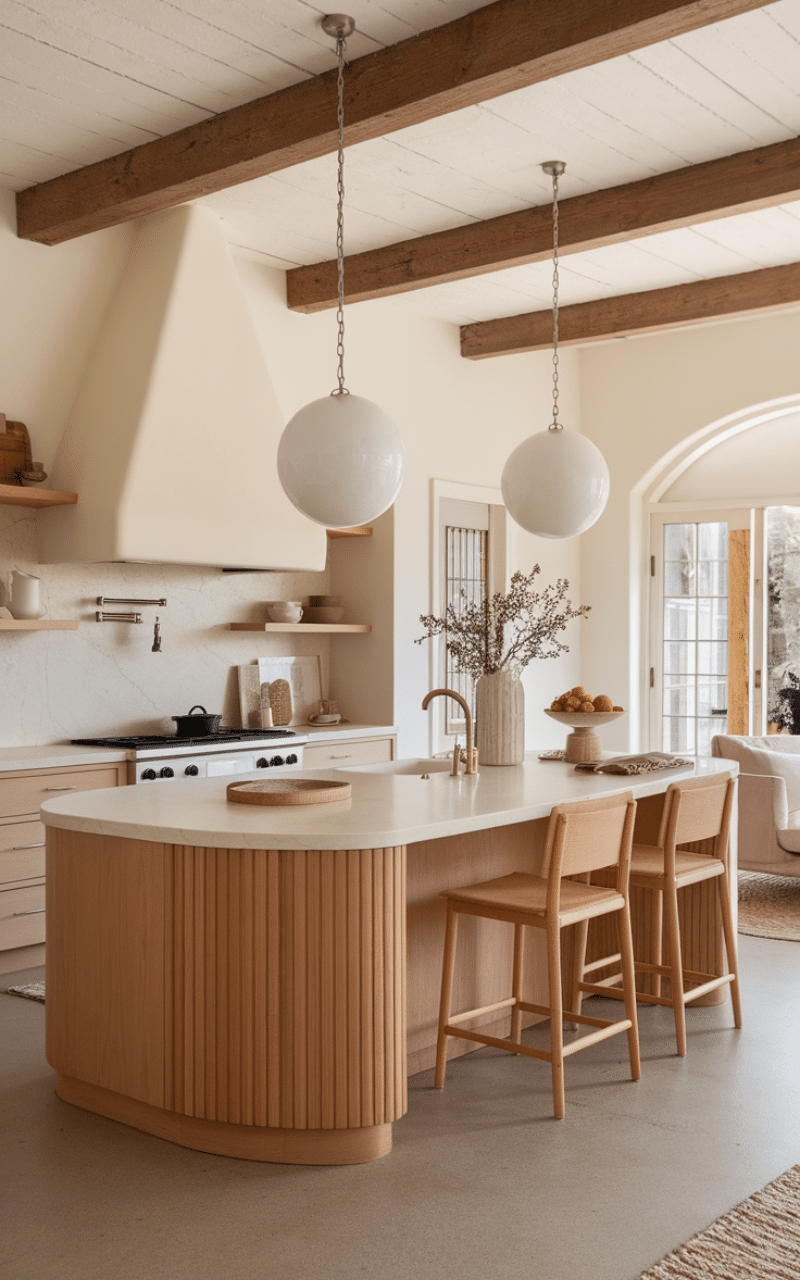 Curved islands create a softer and more welcoming look than straight designs. I enjoy how the rounded shape encourages conversation and allows several people to sit comfortably without feeling crowded. This layout also helps improve movement around the kitchen, especially in open spaces where flow matters.