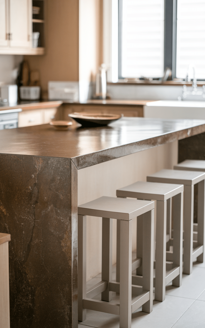 A waterfall countertop instantly makes the island feel like a centerpiece. I really enjoy how the surface flows smoothly down the sides because it creates a clean and modern appearance that feels polished without being complicated. This type of seating arrangement works especially well in open kitchens where the island is visible from multiple angles. Keeping the stools simple allows the countertop detail to stand out while still providing a comfortable place for casual meals and everyday conversations.