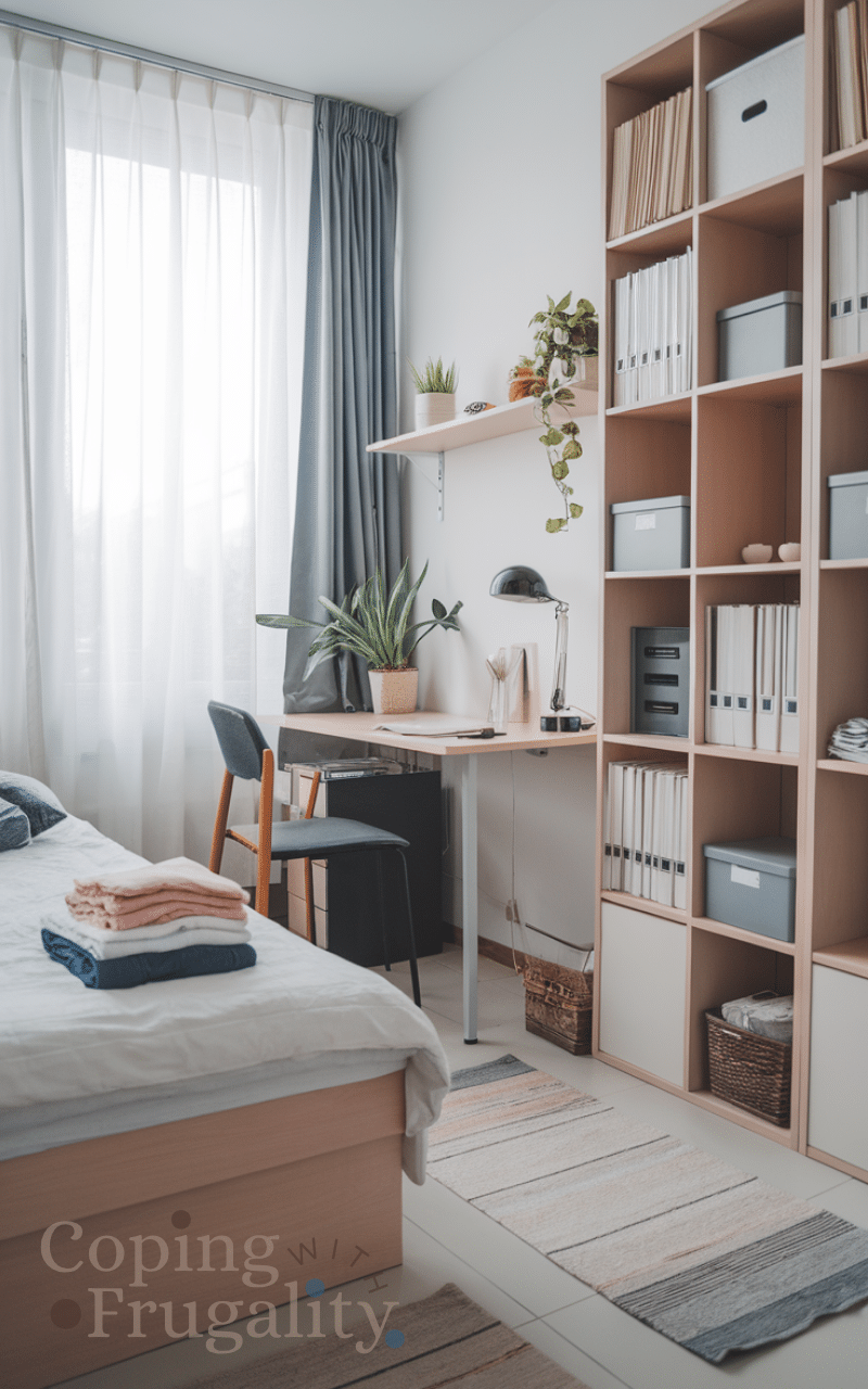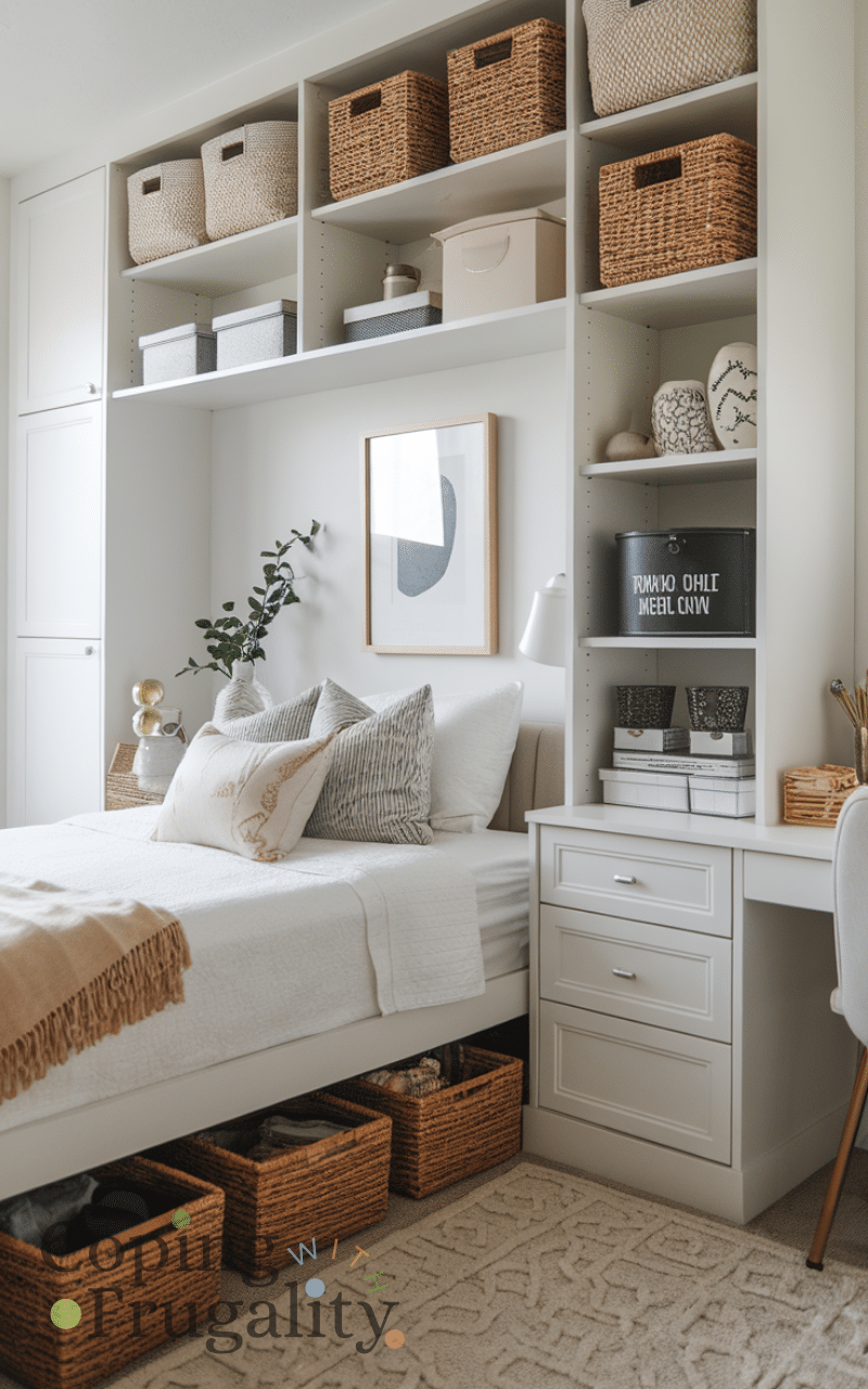 You can place affordable baskets under the bed in cabinets or on shelves to hide clutter and group similar items together so this organization idea on a budget makes your home look more spacious and calm.