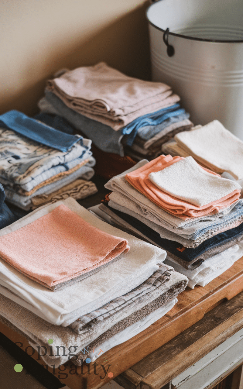 Instead of buying paper towels you can cut your old towels or t-shirts into small squares and use them for dusting wiping or polishing because this cleaning idea on a budget reduces waste and gives your old fabrics a second life.
