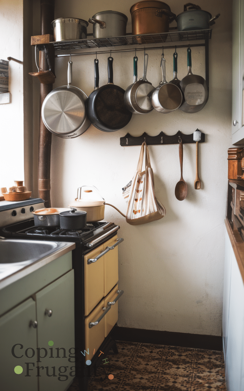 If you have a small kitchen and limited storage then hanging your pots and pans on a wall rack or hooks can save space and make cooking more enjoyable because this organization idea on a budget adds both function and charm to your kitchen decor.