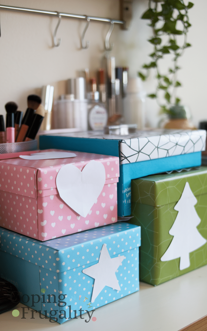 Instead of throwing away shoe boxes you can wrap them in decorative paper and use them to organize your desk makeup or kitchen supplies because this organization idea on a budget keeps everything sorted in a stylish way while also recycling what you already have at home.