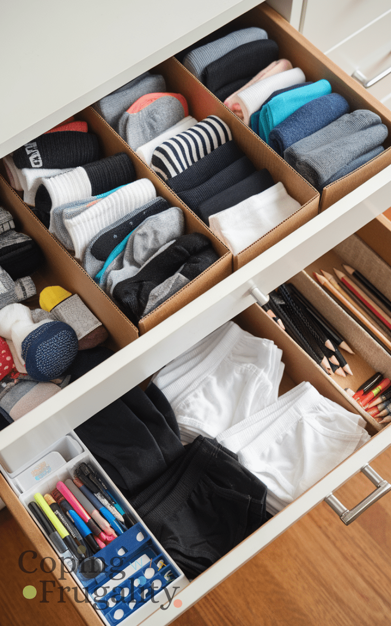 You can cut cardboard from old boxes and use them to divide your drawers for socks underwear or office supplies because this organization idea on a budget helps you create order without spending any money at all.