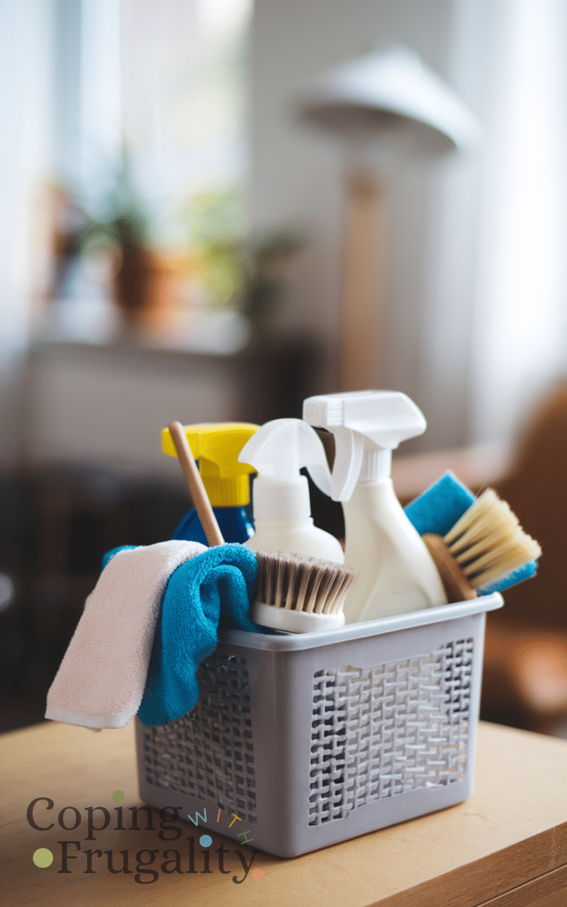 Use a small plastic caddy or basket to hold your sprays cloths and brushes so you can easily carry them from room to room because this organization idea on a budget saves time and keeps your cleaning tools all in one place.