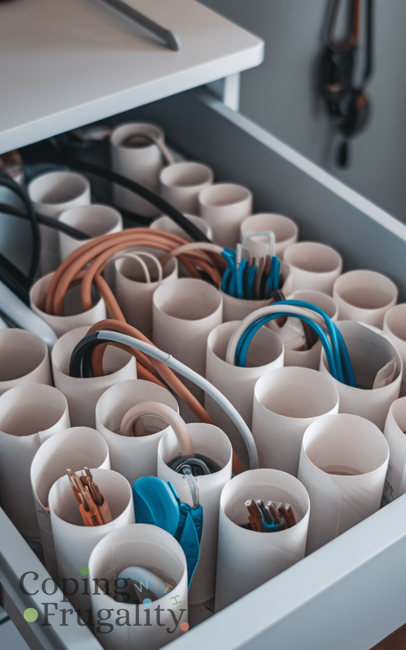 Save empty toilet paper rolls and use them to store and separate cables in a drawer or box because this organization idea on a budget is clever easy and helps prevent the messy tangle of cords that drives everyone crazy.
