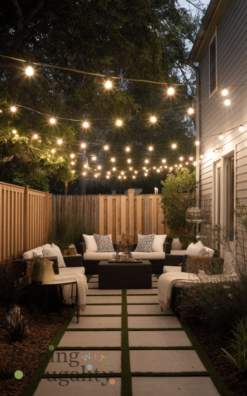 Hanging outdoor string lights is a magical small backyard landscaping idea on a budget for every home since it transforms your backyard into a cozy and inviting space meanwhile you can use affordable LED lights that last long and save energy also arranging them along fences trees or pergolas creates a warm and festive ambiance additionally pairing lights with comfortable seating or small decorations enhances the charm furthermore outdoor lights make evenings more enjoyable and relaxing and finally this idea adds beauty and personality to your backyard without breaking the budget.