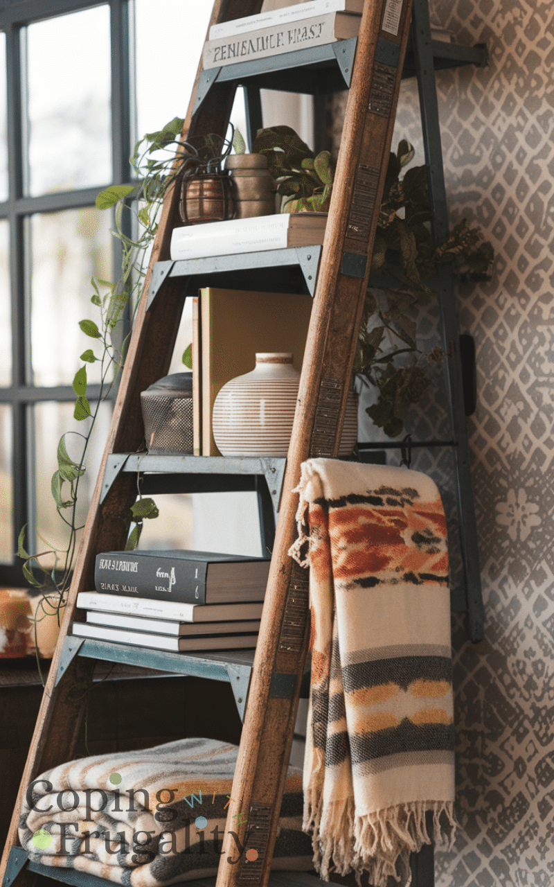 Repurpose old ladder as shelf is a clever thrift store makeover idea on a budget for home decor because you can lean a ladder against the wall and use it to display books plants or blankets and this approach gives your home a rustic chic vibe while also saving space and money and it transforms an old item into a functional piece that enhances your home decor naturally and creatively.