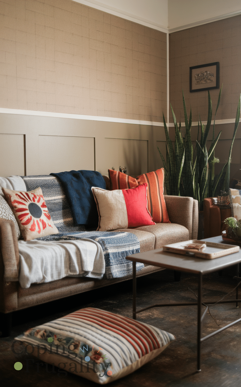 Make throw pillows from old clothes is a simple thrift store makeover idea on a budget for home decor because you can use fabric from old shirts or dresses and sew them into colorful pillows and by doing this you save money reduce waste and add a cozy personal touch to your living room or bedroom which makes your home decor more inviting and cheerful.