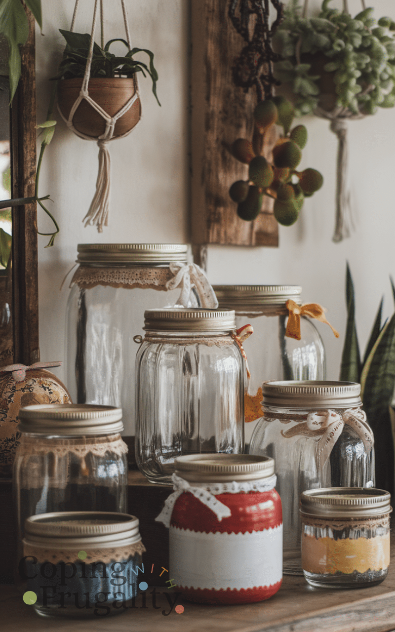 Upcycle glass jars is another creative thrift store makeover idea on a budget for home decor because you can turn empty jars into vases or storage containers and you can decorate them with ribbons or paint and this idea not only helps you save money but also brings a charming handmade touch to your home decor and you can use jars in the kitchen living room or bathroom for a practical and stylish solution.