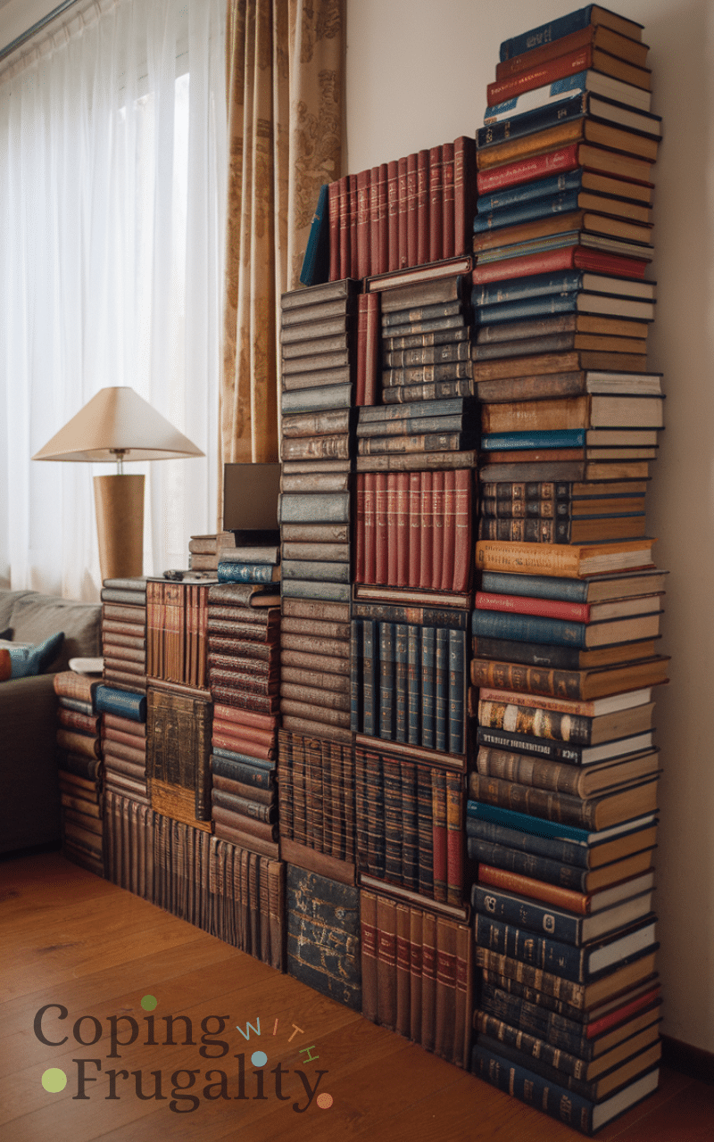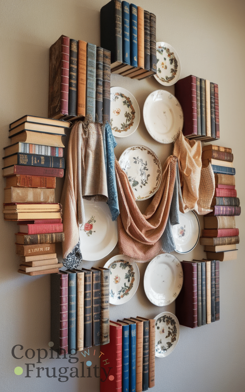 Repurpose old books as decor is a clever thrift store makeover idea on a budget for home decor since you can stack books or use them to create shelves and tables and this idea adds literary charm and a vintage vibe to your home and by using old books creatively you can decorate your living room bedroom or office and it makes your home decor feel cultured cozy and unique while staying very affordable.