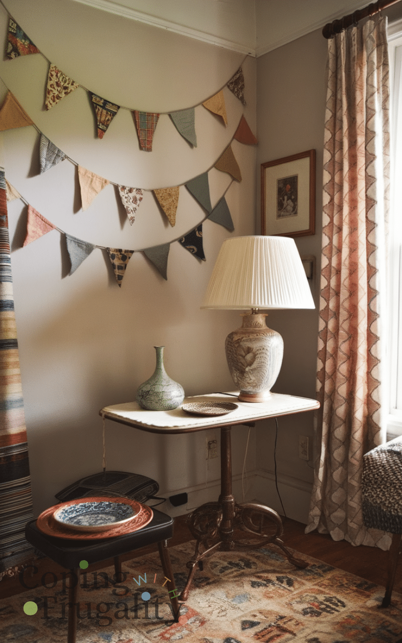 Sew fabric bunting is a charming thrift store makeover idea on a budget for home decor because you can cut old fabric into triangles and string them together for decorations and this idea works for parties seasonal decor or everyday charm and it brings color texture and a handmade touch to your space which enhances your home decor beautifully without spending a fortune and it also allows you to use scraps creatively.