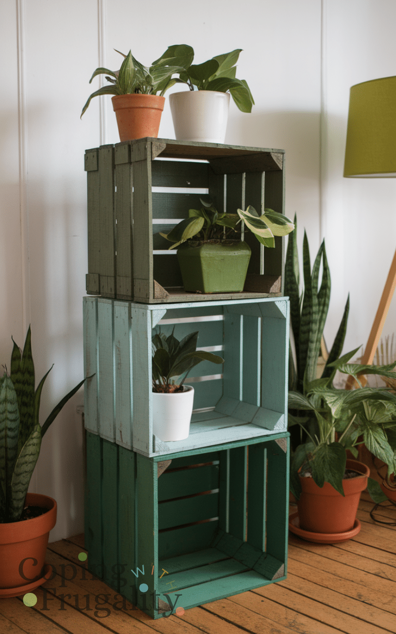 Make a plant stand from old crates is a green thrift store makeover idea on a budget for home decor as you can stack crates and paint or stain them and use them to display indoor plants and this transforms simple crates into functional decor that adds life and vibrancy to any room and incorporating plants in your home decor brings freshness beauty and a relaxing atmosphere while staying within budget and creative limits.
