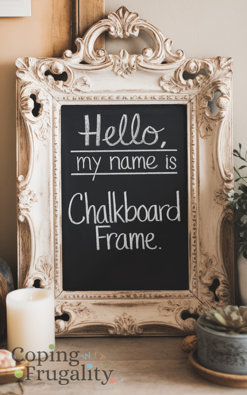 Make a chalkboard from old frames is a useful thrift store makeover idea on a budget for home decor as you can add chalkboard paint to a frame and use it for notes recipes or quotes and this idea not only saves money but also brings an interactive and fun element to your home and you can place it in the kitchen or office which makes your home decor more practical and playful and encourages creativity in daily life.