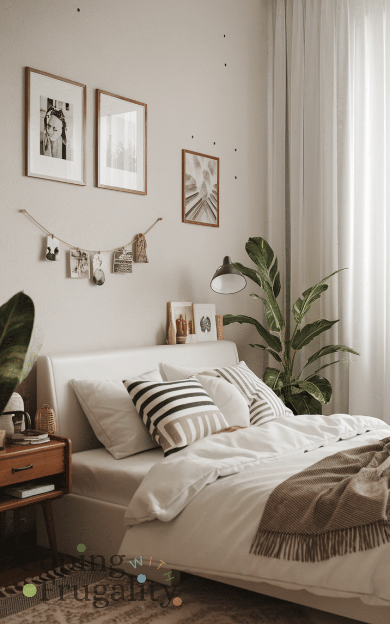 Personalizing your bedroom with photos and keepsakes makes the space feel uniquely yours while keeping it cozy and chic and using frames or string displays adds a stylish touch and placing meaningful items around the room creates warmth and comfort and rotating photos or mementos refreshes the space without spending money and this simple idea ensures your bedroom decor feels personal and inviting while remaining budget-friendly and adding touches of your personality enhances the overall cozy and chic vibe.