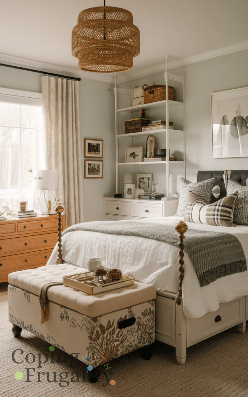Incorporating multi-functional furniture like a storage ottoman or a bed with drawers helps you save money and space while keeping your bedroom cozy and chic and these pieces allow you to store items neatly while also serving as seating or display surfaces and clever furniture choices make the room feel organized and stylish at the same time and selecting affordable options ensures your bedroom decor feels complete without expensive investments and it encourages a cozy and uncluttered atmosphere.