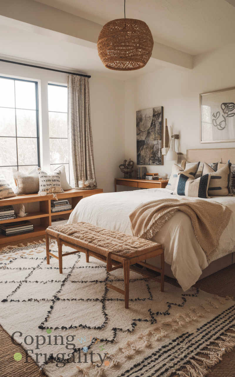 Layering rugs can transform a plain bedroom into a cozy and chic retreat and choosing affordable rugs in different textures and colors can add warmth and personality and placing a larger rug under your bed and a smaller one near your reading corner creates a layered effect that feels stylish and inviting and mixing patterns and materials helps your space feel lived-in and cozy while still looking thoughtfully decorated and this budget-friendly idea works with almost any bedroom style.