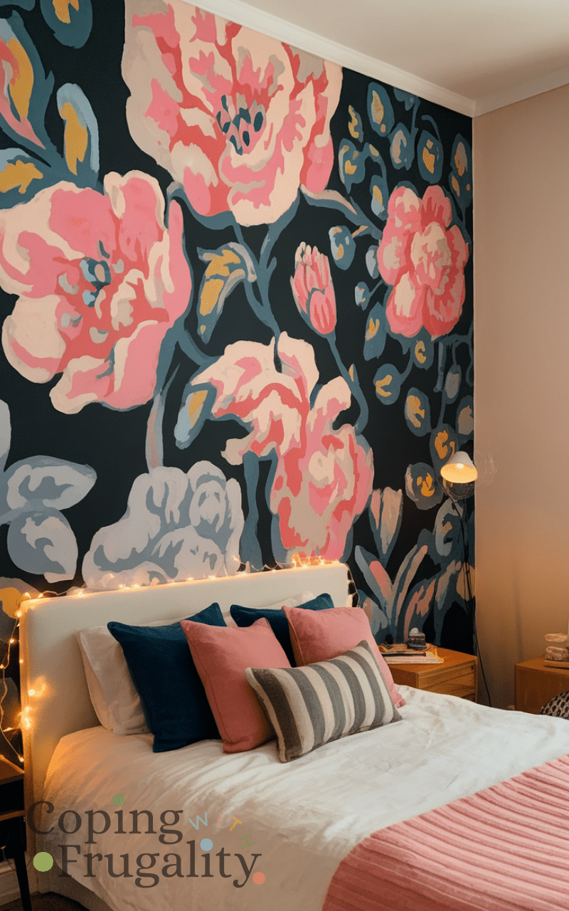 Choosing a statement wall with paint or removable wallpaper adds a bold and chic element while keeping your bedroom cozy and budget-friendly and using colors or patterns that complement your furniture makes the room feel harmonious and inviting and a single accent wall draws attention without overwhelming the space and combining it with simple decor like fairy lights or artwork enhances the cozy atmosphere and this inexpensive approach transforms your bedroom decor into a stylish sanctuary with minimal effort.