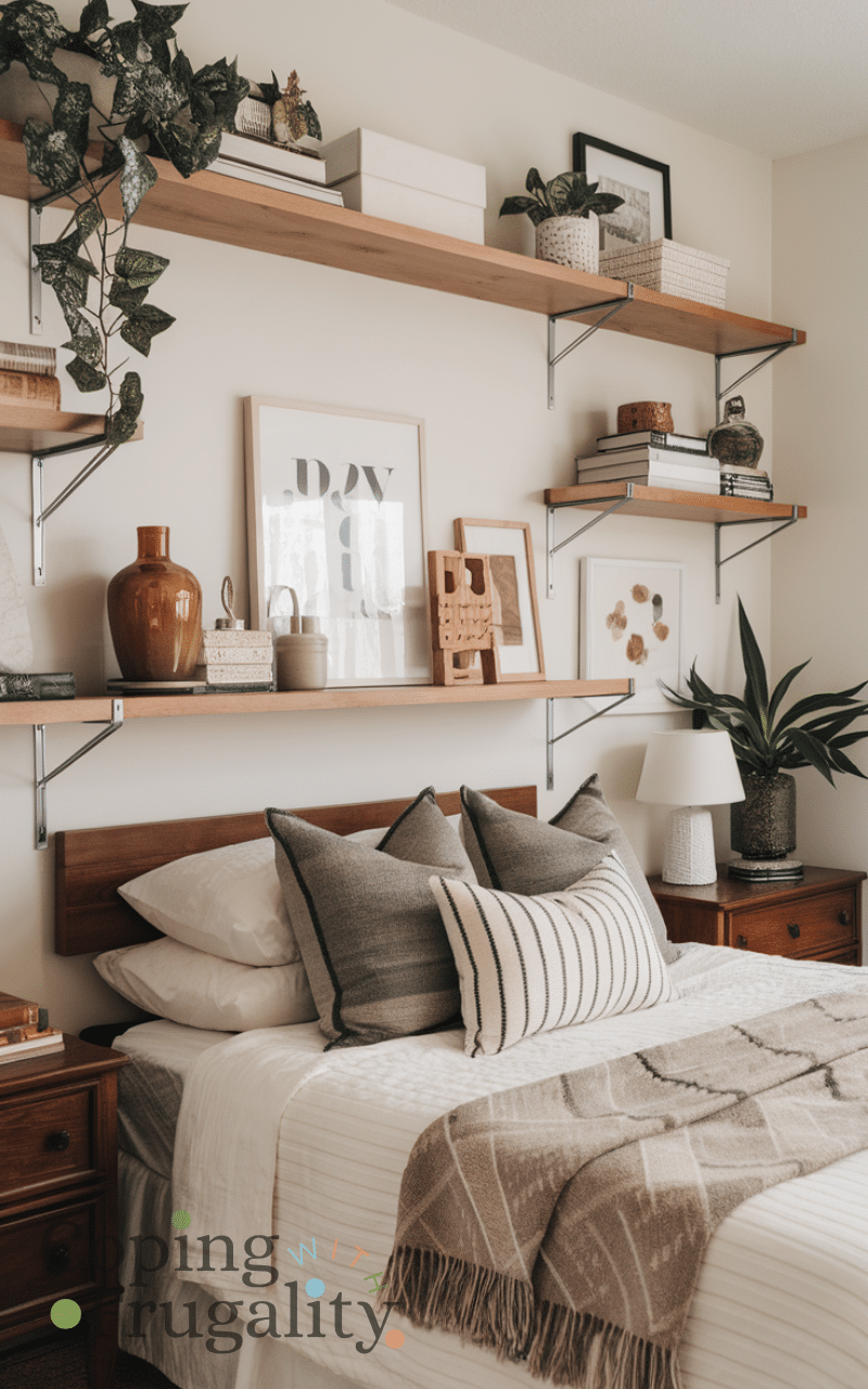 Installing floating shelves allows you to display books, plants, and decorative items making your bedroom feel cozy and chic and using affordable materials or DIY options keeps the project budget-friendly and arranging your favorite items on shelves adds personality and charm and combining functionality with decoration ensures your space feels well-curated and inviting and shelves also free up surface clutter while enhancing the room’s aesthetic and this clever addition keeps your bedroom decor stylish and warm without spending too much.