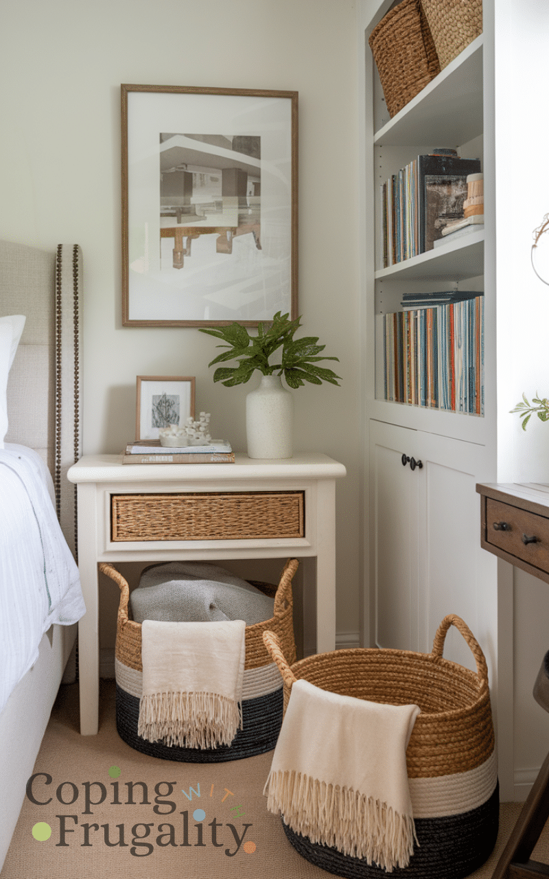 Using decorative baskets for storage keeps your bedroom organized while adding a chic and cozy element and they are budget-friendly and versatile and you can place them under tables or in corners to store blankets and accessories and natural materials like wicker or rattan bring warmth and texture and grouping baskets together creates a visually pleasing display that elevates your bedroom decor while staying practical and stylish and this small detail enhances the cozy feel and chic look of your space.