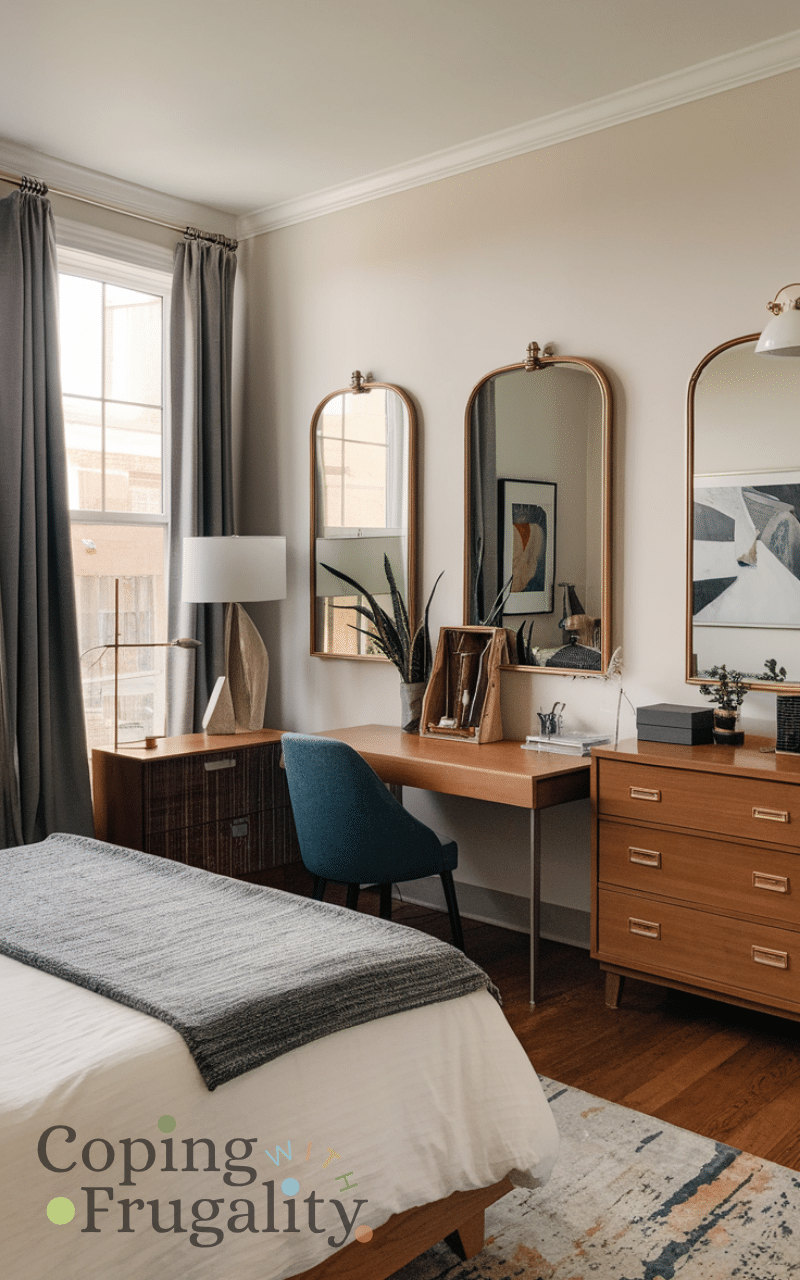 Adding mirrors strategically in your bedroom helps make the space feel bigger and chic and reflecting natural light creates a warm and cozy atmosphere and choosing affordable mirrors or DIY frames makes this idea budget-friendly and placing them near windows or above dressers adds elegance and depth and mirrors also act as decorative accents while increasing functionality and this simple adjustment enhances your bedroom decor and gives a stylish and cozy vibe without major renovations.