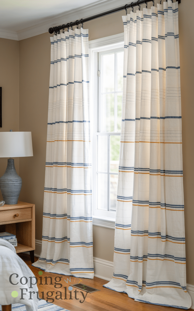 Hanging DIY curtains made from affordable fabric or repurposed textiles can transform your bedroom decor into a cozy and chic sanctuary and sewing simple curtains or even using clip-on rings is budget-friendly and adds softness and warmth to the space and choosing colors that complement your room enhances the cozy vibe and letting light filter through creates a peaceful atmosphere and this simple idea allows your bedroom decor to feel personal and elegant without expensive window treatments.