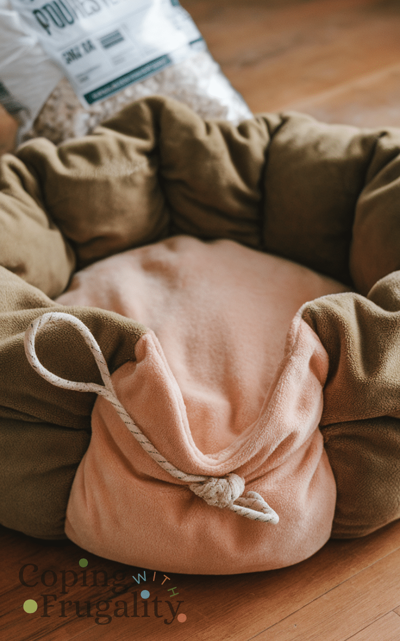 If you do not like sewing you can still make a DIY pet bed on a budget that looks store-bought by using fleece fabric and stuffing and all you have to do is cut two equal-sized fleece pieces and tie the edges together while leaving an opening to insert the filling and this creates a soft and snug cushion that pets adore and it is lightweight easy to wash and perfect for travel or quick naps and you can mix different colors and patterns to match your style and your pet will enjoy the softness and warmth while you enjoy how affordable and easy it was to create.