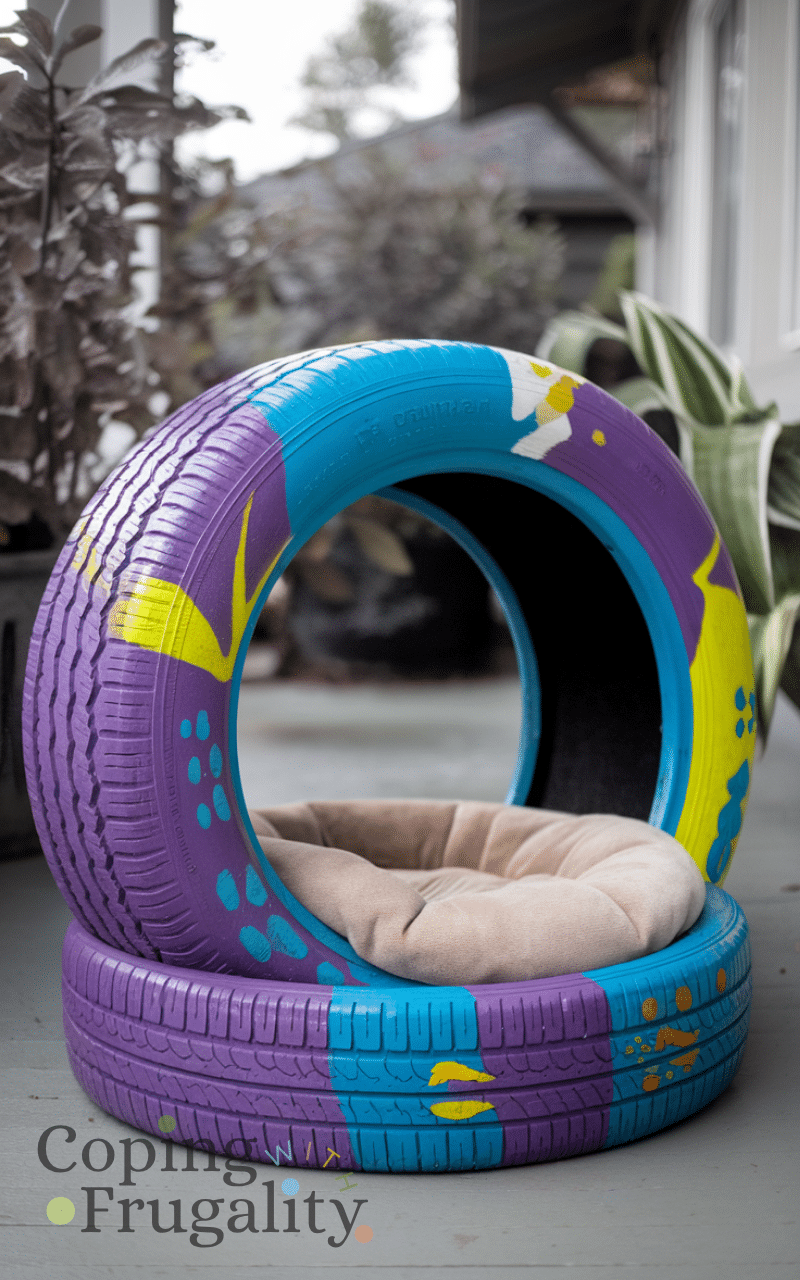 Using an old car tire you can create a durable DIY pet bed on a budget that looks store-bought because it offers a unique and modern design that fits both indoor and outdoor spaces and you can clean and paint the tire with bright colors or patterns and then fill it with a soft round cushion or blanket inside and this eco-friendly project reuses old materials while giving your pet a stylish place to sleep and relax and it works great for medium or large dogs and you can easily move it around or place it on a porch or patio and your pet will love the comfort and the cool look of their new bed.