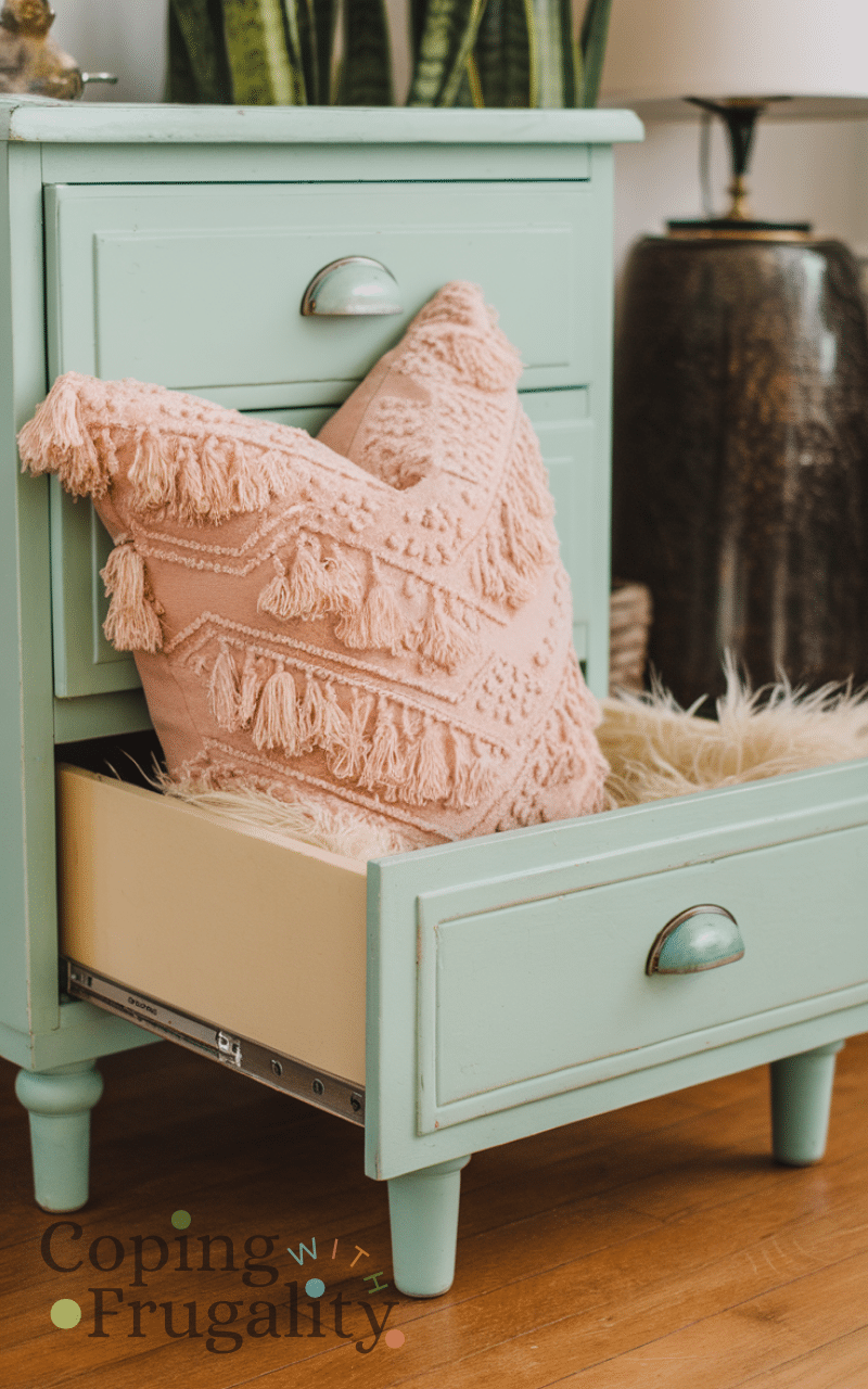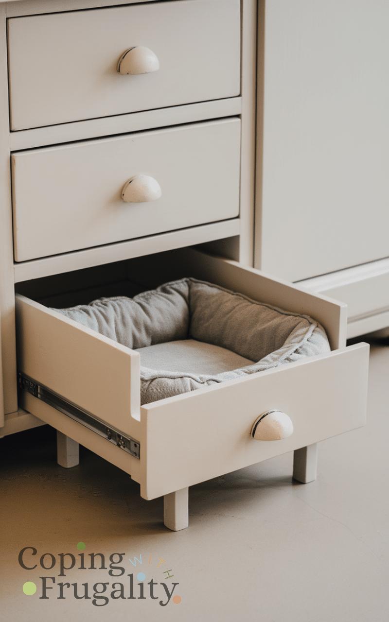 An unused drawer can turn into a cute DIY pet bed on a budget that looks store-bought because it already has a box-like shape that fits perfectly for small pets and you can paint it in a matching color to your furniture and add short legs or wheels for extra charm and ventilation and inside place a comfy cushion or blanket and maybe even write your pet’s name on the front for a personalized touch and this creative bed adds both functionality and beauty to your space and your pet will love curling up inside their new cozy retreat and it costs almost nothing compared to store-bought beds.