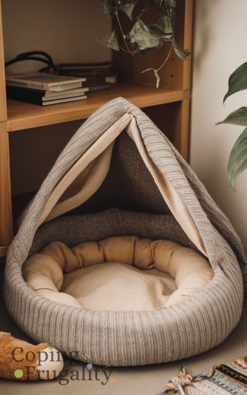 By using an old sweater you can make a warm and soft DIY pet bed on a budget that looks store-bought because the familiar scent and softness of the sweater make pets feel secure and loved and you just need to sew the bottom closed fill it with old fabric or stuffing and tie the sleeves together to create a round cuddly shape and your pet will instantly fall in love with this comfy bed and it also saves money while reusing clothes you no longer wear and the best part is that it looks adorable and stylish in any corner of your home while keeping your furry friend warm and happy.