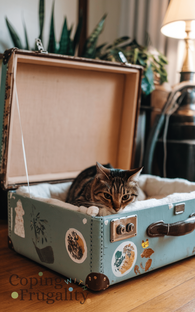 An old suitcase can become a creative DIY pet bed on a budget that looks store-bought because it offers a vintage and chic design that adds personality to your home and all you need to do is remove the top lid or prop it open safely then place a soft pillow or cushion inside and you can decorate the exterior with paint or stickers for a personalized touch and this bed works well for cats or small dogs who enjoy cozy enclosed spaces and it is portable and lightweight which makes it easy to move around the house and this charming DIY idea is budget-friendly yet looks like it came from a luxury pet store.