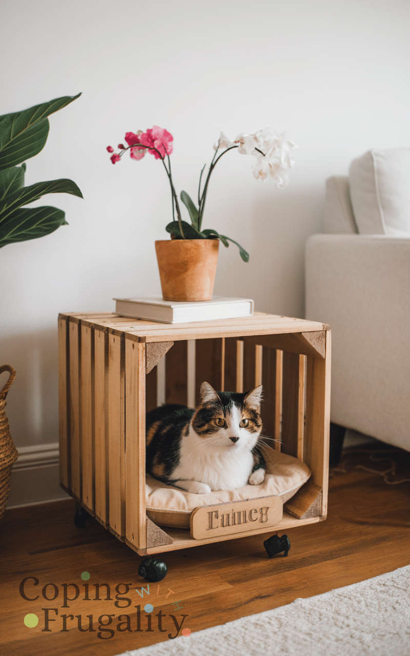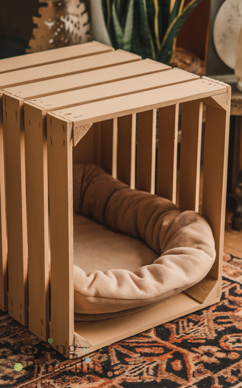 A wooden wine crate can easily become a luxurious DIY pet bed on a budget that looks store-bought because the natural wood texture adds sophistication while being durable and eco-friendly and you just need to sand it smooth add a coat of paint or varnish and place a cushion inside and maybe personalize it with your pet’s name on the front and this bed fits perfectly for cats or small dogs and you can even add small wheels to make it portable and it gives your pet a comfy place to rest while elevating the look of your space.