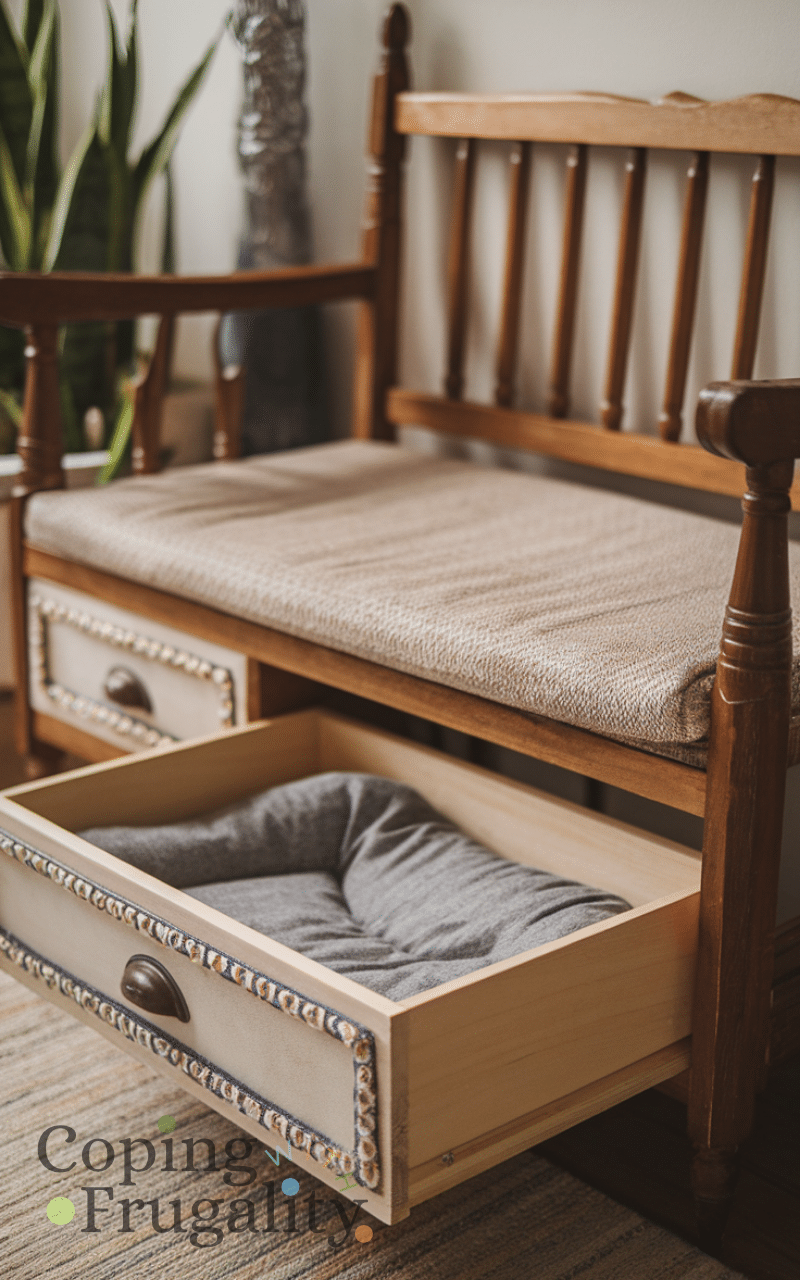 You can upcycle an old bench with a drawer space to make a multifunctional DIY pet bed on a budget that looks store-bought because it combines storage and comfort in one and you can turn the bottom drawer into your pet’s bed by adding a cushion and decorating it with fabric or paint and this idea saves space and keeps your home organized and stylish and your pet will love resting close to you while you enjoy a neat and creative furniture piece that looks expensive but costs very little to create from reused materials.