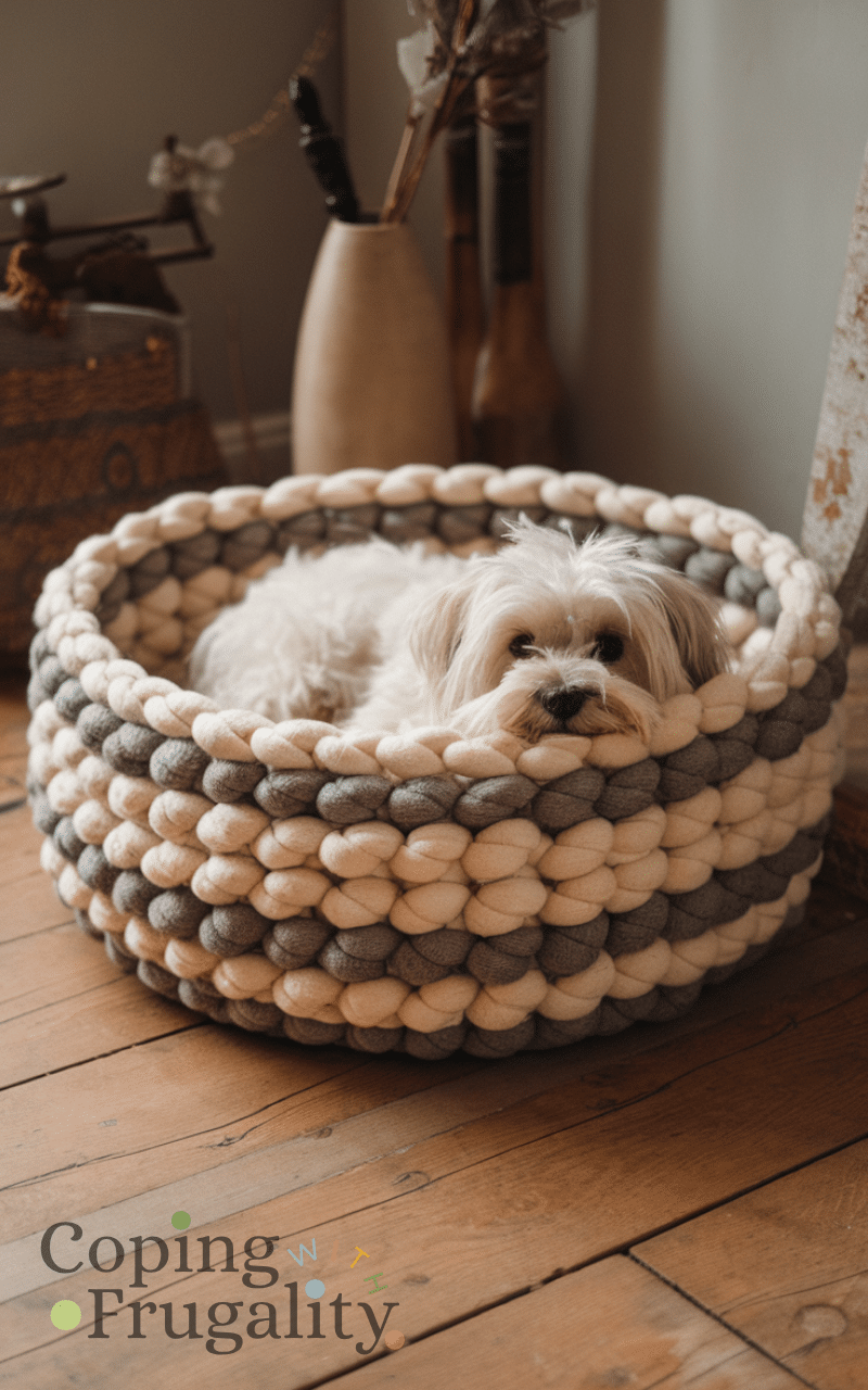 By using chunky yarn you can knit or crochet a beautiful DIY pet bed on a budget that looks store-bought because the thick texture creates a luxurious look and soft comfort for your pet and you can shape it into a round or oval basket that fits your pet perfectly and it is a relaxing craft project that adds a personal touch to your home and you can choose any color to match your decor and your pet will love snuggling inside this soft handmade masterpiece that looks straight out of a boutique shop yet costs very little to make.