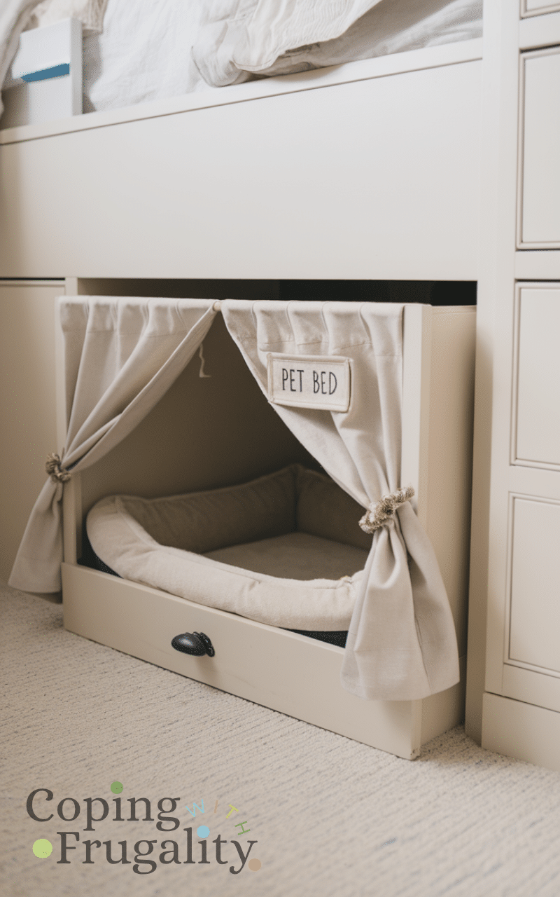 If you have space under your bed you can slide in an old drawer to create a simple DIY pet bed on a budget that looks store-bought because it gives your pet their own private nook while keeping your room organized and neat and you just need to line the drawer with a soft cushion or fabric and maybe add a small curtain or label and this hidden design is ideal for pets who enjoy cozy enclosed spaces and it looks elegant while being inexpensive and practical and your pet will love having their own corner close to you every night.