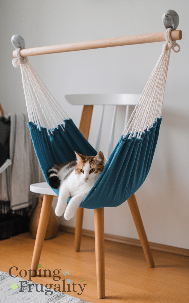 You can make a relaxing DIY pet bed on a budget that looks store-bought by creating a hammock-style bed for your pet using strong fabric and sturdy hooks and this design is perfect for cats or small dogs who love lounging off the ground and you can attach the hammock under a chair table or even in a window frame to give your pet a cozy place to nap and watch the world and it is stylish fun and easy to make while saving space and your pet will adore the gentle swinging motion that keeps them calm and comfortable all day long.