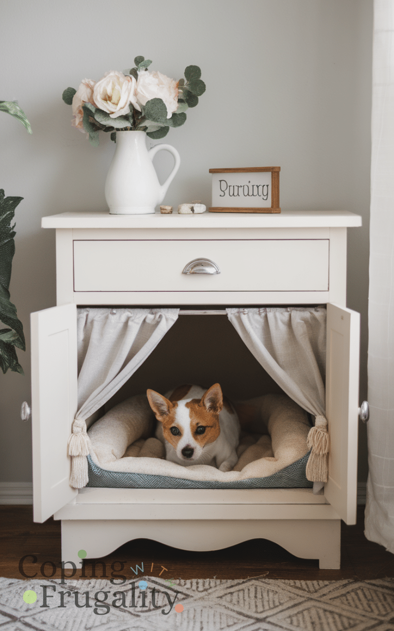 You can create a clever DIY pet bed on a budget that looks store-bought by turning an old cabinet or nightstand drawer into a hidden sleeping space for your pet and you just need to remove one or two drawers line the inside with a soft pillow or blanket and maybe add curtains or a small sign with your pet’s name and this setup keeps your home looking tidy and stylish while giving your pet a cozy private area to relax and it is affordable and creative and adds charm to your home decor while serving both as storage and a bed for your furry friend.