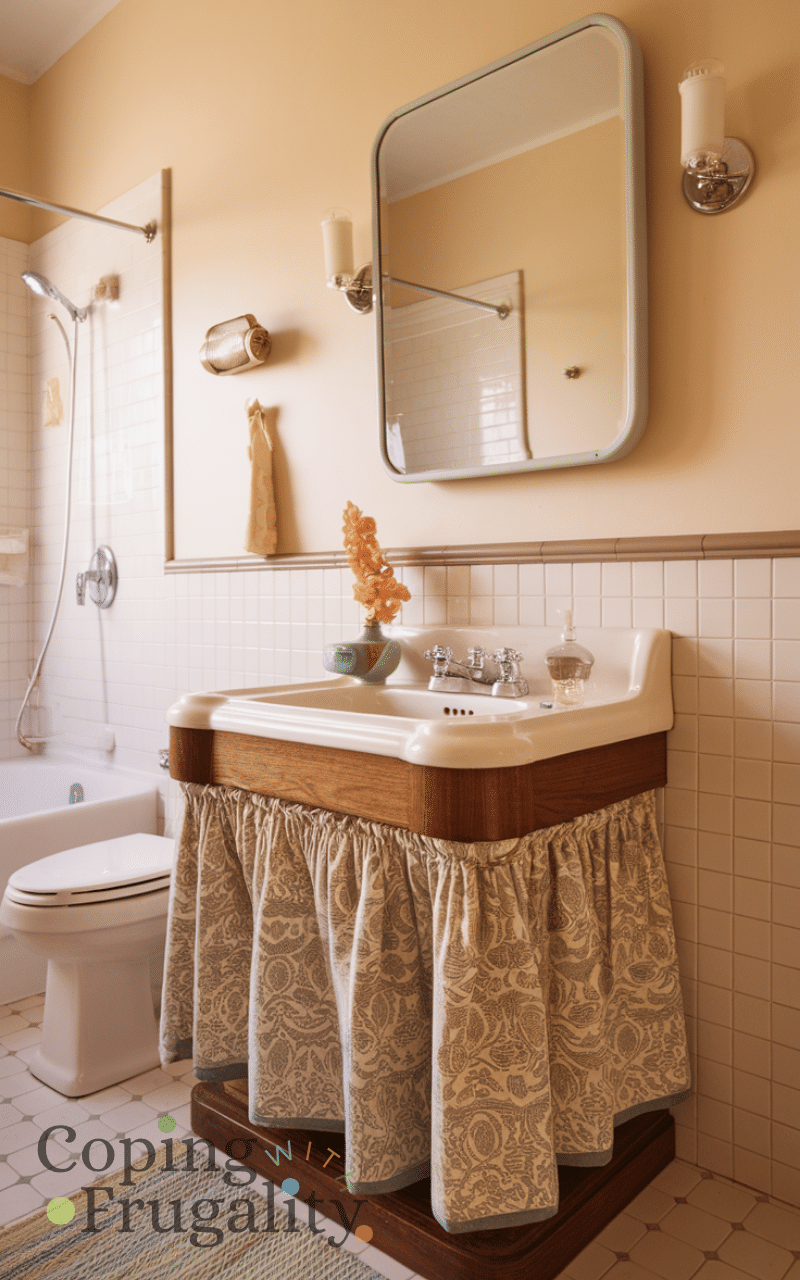 Adding a skirted sink cabinet is a creative way to introduce softness into Retro Bathroom Decor, fabric skirts hide storage areas while also adding vintage charm that feels warm and welcoming inside the bathroom, choosing patterned fabrics or pastel tones helps connect the sink area with the rest of the decor theme easily, this simple upgrade transforms the sink into a decorative feature rather than just a functional element, and it allows your Retro Bathroom Decor to feel cozy and stylish without needing large structural changes.