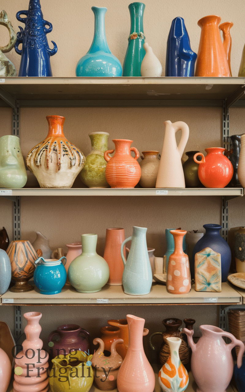 Thrift stores are full of quirky ceramic vases in all shapes and sizes. Grouping several together on a shelf or table creates visual interest. This thrift store decor finds styling on a budget idea lets you experiment with color, texture, and height for a layered, stylish look. You can also paint or distress them to match your décor. Ceramic vases are versatile—they hold flowers or stand alone as sculptural pieces—making them perfect for budget-conscious home styling.