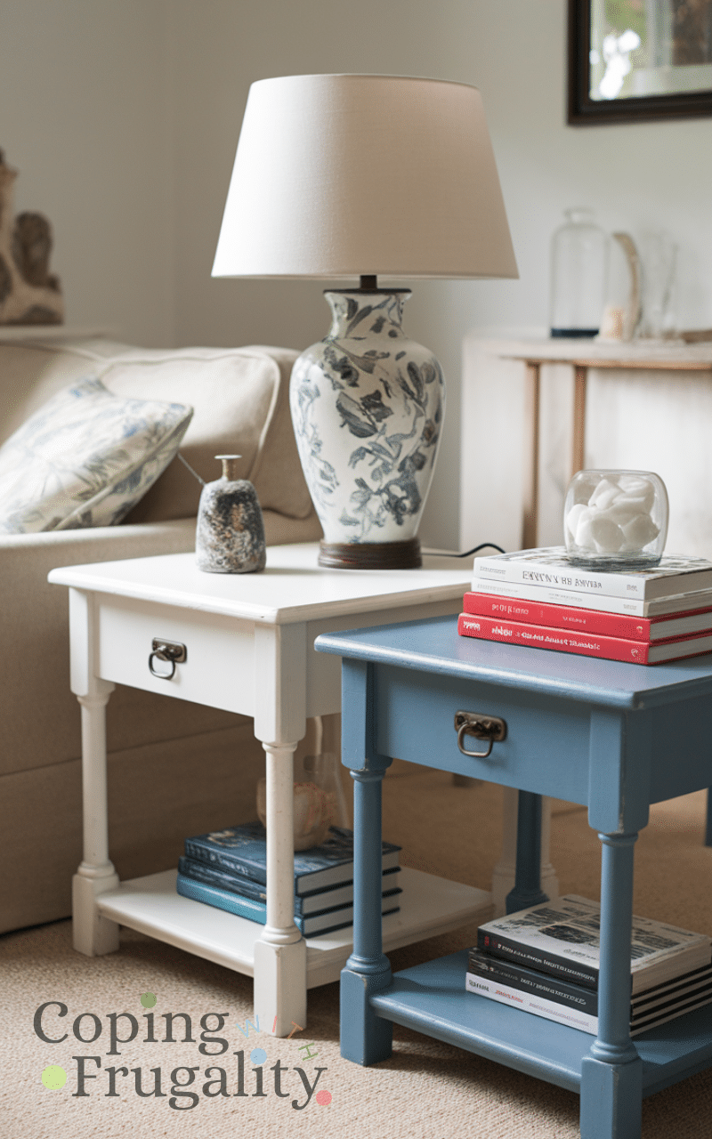 Thrifted side tables can be repurposed with paint or new hardware. This thrift store decor finds styling on a budget idea adds function and style to living rooms, bedrooms, or entryways. They’re perfect for holding lamps, books, or decorative objects. A fresh coat of paint or a bit of sanding can turn a dated piece into a chic accent, proving that stylish furniture doesn’t have to be expensive.