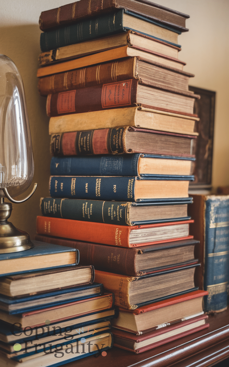 Stack or arrange old books for instant charm on shelves, tables, or mantels. This thrift store decor finds styling on a budget idea brings color, texture, and personality. Books can be displayed upright or stacked horizontally, and you can even use pages for DIY crafts or wall art. They’re timeless, inexpensive, and perfect for styling on a budget while giving your home a cozy, intellectual vibe.