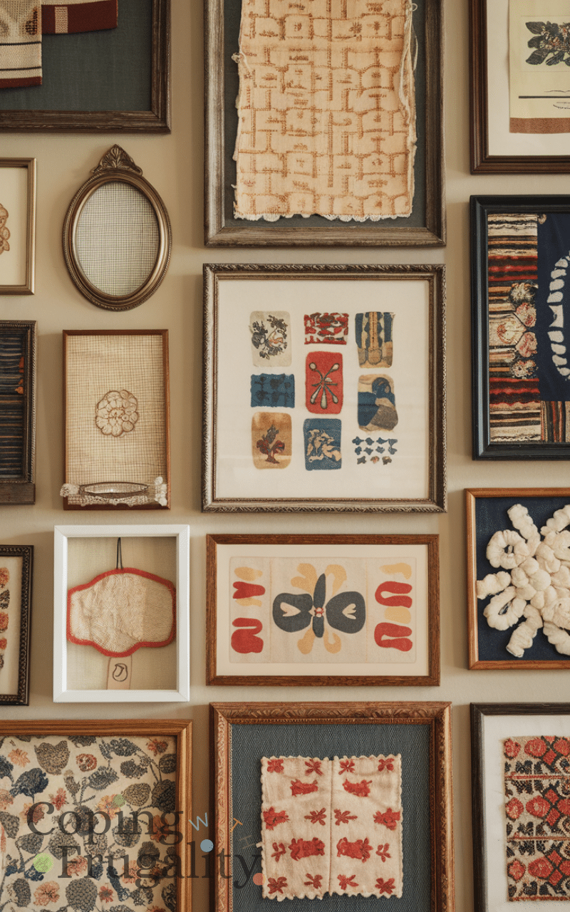 Old fabrics can be framed as instant wall art. This thrift store decor finds styling on a budget idea allows you to add color, pattern, and texture creatively. Frames can be thrifted too, keeping costs minimal. By mixing fabrics and frames, you can create a custom gallery wall that feels curated, unique, and stylish—all while sticking to a budget.