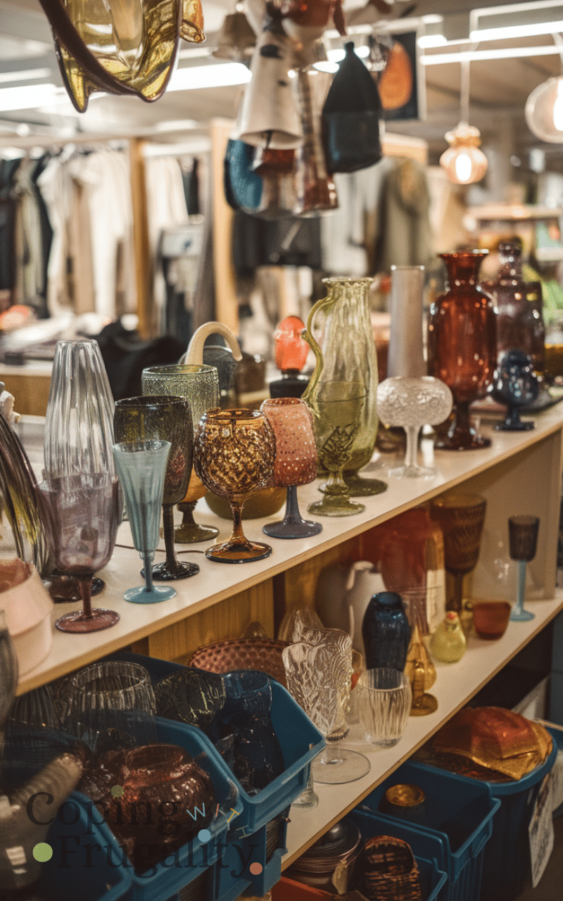 Thrift stores are full of unique glassware, from goblets to vases. This thrift store decor finds styling on a budget idea turns everyday items into eye-catching displays. Arrange by color, size, or shape to create an organized, visually appealing collection. Glassware can be functional for dining or purely decorative for shelves, adding charm and style without high costs.